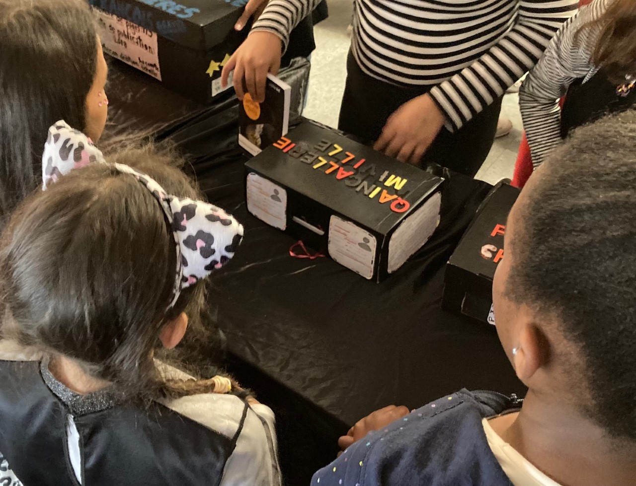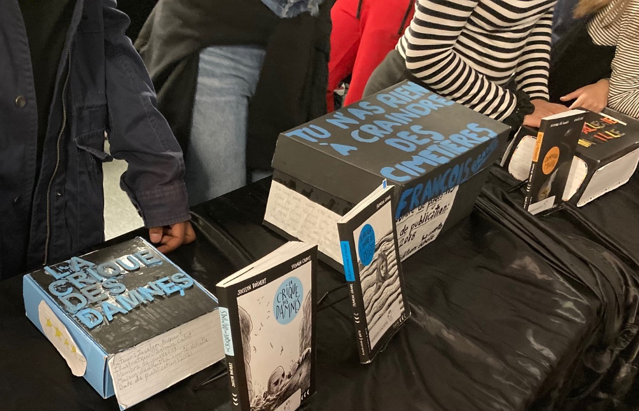 Le 31 octobre dernier, les élèves de la classe 322 ont lancé leur salon du livre durant lequel ils nous ont présenté les romans de la collection noire de la Courte Échelle. Ils ont travaillé fort à l'analyse et la compréhension du rôle d'auteur de roman d'horreur, d'enquête et de mystère. Ce réseau sur la collection les a grandement stimulés dans leur désir de lire et d'écrire des histoires. Leur motivation était à son maximum pour recevoir les parents, les élèves et les membres du personnel.